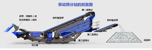履带移动筛分站的设计理念宗旨是站在客户的立场,把消除破碎场地、环境、繁杂基础配置及繁杂物流带给客户破碎作业的障碍,作为首要的解决方案。本着物料"接近处理"的新概念原则,根据不同的破碎工艺要求组成 "先碎后筛",也可以组成 "先筛后碎"流程,破碎站可按照实际需求组合为粗碎、细碎两段筛分系统,也可组合成粗中细三段筛分系统,具有很高的灵活性。